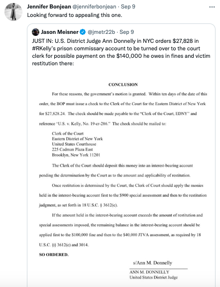 “Undersigned counsel writes to respectfully request that Defendant Kelly be permitted to appear via zoom for the September 28th, 2022, restitution hearing,”