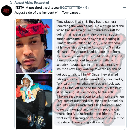 “They staged that sh*t, they had a camera recording the whole time. He ain’t go post the video because he go incriminate himself for doing that h** a** sh**. Anyone can sucker punch someone when they not expecting it. That man was talking to Tory , who let them girls hype him up cause August didn’t shake his hand. Tory stated and I quote this from the security mouths ” I should go slap this mf, then proceeded out towards us with his security, August was in the truck already with me then saw Tory walking towards us and he got out to talk to him Once they started talking about what happened on social media, Tory said “I’m on whatever you on, took two steps to the left handed the security his blunt, all while August was moving to the side thinking they was about to talk in private when Tory sucker punched him, then ran behind his security who already had a line formed. Tory went in the building performed ran out the side door. There you go all Facts”