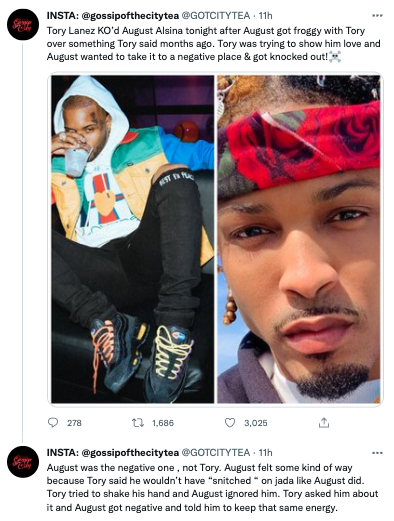 “Tory Lanez KO’d August Alsina tonight after August got froggy with Tory over something Tory said months ago. Tory was trying to show him love and August wanted to take it to a negative place & got knocked out!”