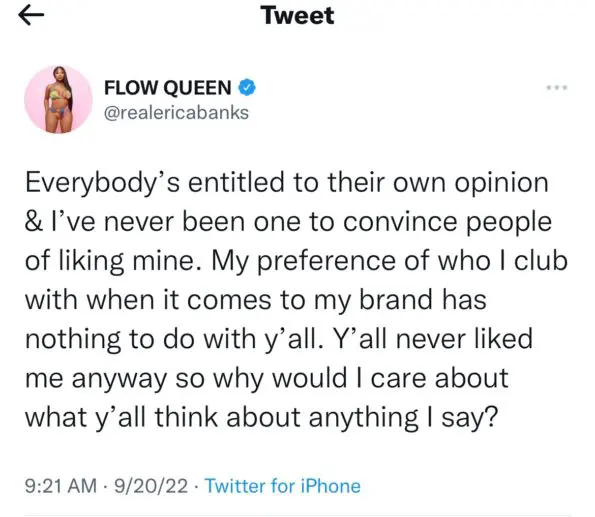 “Everybody’s entitled to their own opinion & I’ve never been one to convince people of liking mine. My preference of who I club with when it comes to my brand has nothing to do with y’ all. Y’all never liked me anyway so why would I care about what y’all think about anything I say?”