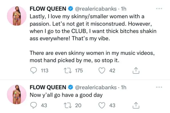 “Lastly, I love my skinny/smaller women with a passion. Let’s not get it misconstrued. However, when I go to the CLUB, I want thick bitches shakin ass everywhere! That’s my vibe. There are even skinny women in my music videos, most hand picked by me, so stop it.”