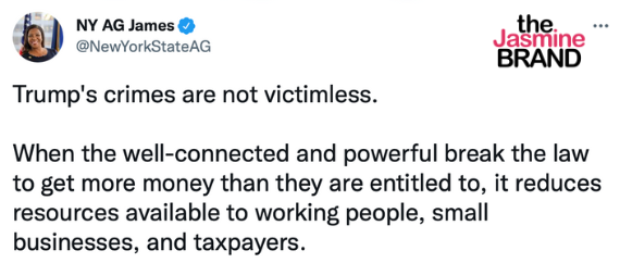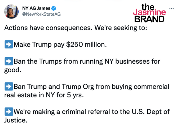 “Actions have consequences. We’re seeking to: Make Trump pay $250 million. Ban the Trumps from running NY businesses for good. Ban Trump and Trump Org from buying commercial real estate in NY for 5 yrs. We’re making a criminal referral to the U.S. Dept of Justice.”