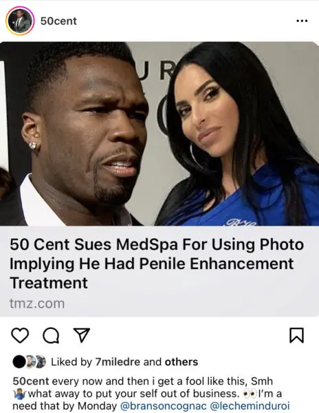 According to reports, 50 Cent, 47, is suing the owner of a Miami, Florida medical spa over allegations that she used an innocent photo with the businessman to falsely suggest that he’d had penile enhancement surgery.