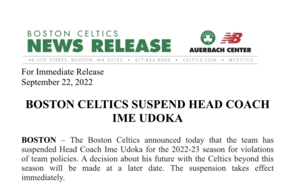 “The Boston Celtics announced today that the team has suspended Head Coach Ime Udoka for the 2022-23 season for violations of team policies.”