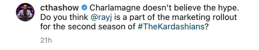 During the Comedy Central interview, Charlamagne flat out asked Ray if his recent lashing out against the Kardashian’s was a PR stunt. The Breakfast Club host noted that The Kardashian’s season two conveniently aired only a couple of weeks after Ray released contracts and receipts, allegedly proving Kris Jenner was the mastermind behind the sex tape deal. Though Ray denied the notion on the episode, a promo posted on the HOAW official instagram page claimed Charlamagne “doesn’t believe the hype.”