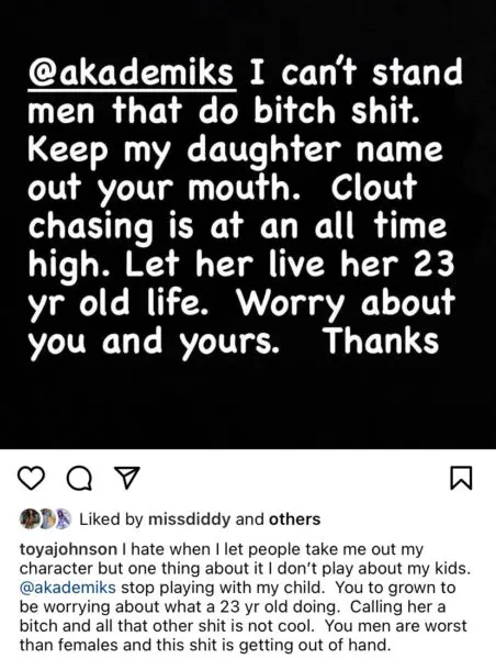 I hate when I let people take me out my character but one thing about it I don’t play about my kids. @akademiks stop playing with my child. You to grown to be worrying about what a 23 yr old doing. Calling her a b*tch and all that sh*t is not cool. You men worse than females and this sh*t is getting out of hand.”