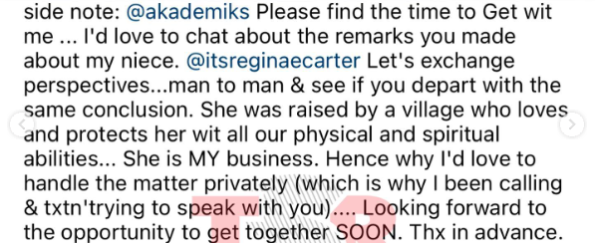 “side not: @akademiks Please find the time to Get wir me … I’d love to chat about the remarks you made about my niece. @itsreginaecarter Let’s exchange perspectives…man to man & see if you depart with the same conclusion. She was raised by a village who loves and protects her wit all our physical and spiritual abilities… She is MY business. Hence why I’d love to handle the matter privately (which is why I been calling & txtn trying to speak with you)…. Looking forward to the opportunity to get together SOON. .Thx in advance.
