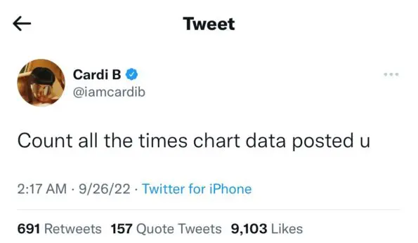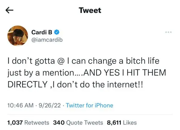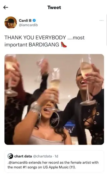 Fans flooded the comments assuming the tweet was directed to Cardi B after the Bronx native retweeted a post sharing that she achieved a new record and is now the female artist with the most #1 songs on Apple Music.
