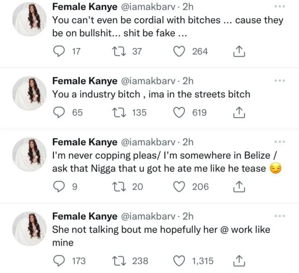 “I hate a h** that throw rocks and hide their hands.. been subtweeting me for months and now you wanna make it about another woman as a shield. Stand on your sh*t!!”