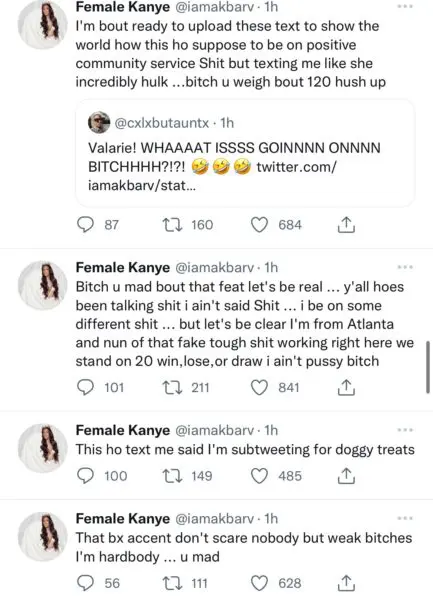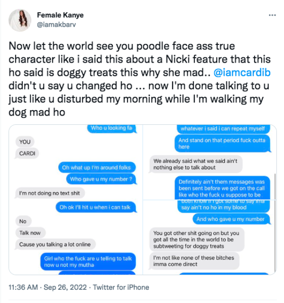 “Now let the world see you poodle face ass true character like I said this is about a Nicki feature that this ho said is doggy treats this why she mad.. @iamcardib didn’t u say u changed h* … now I’m done talking to u just like u disturbed my morning while I’m walking my dog mad h*.”