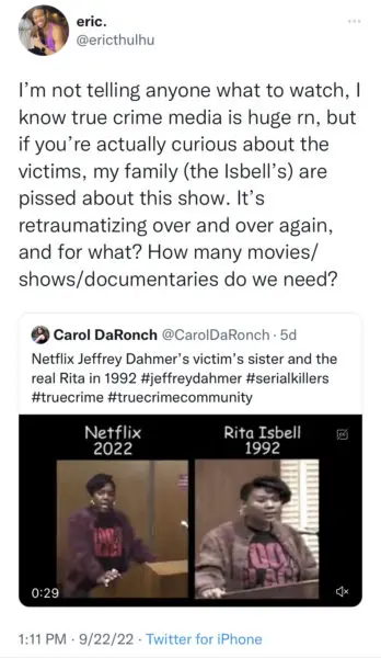 “I’m not telling anyone what to watch, I know true crime media is huge rn, but if you’re actually curious about the victims, my family (the Isbell’s) are pissed about this show. It’s retraumatizing over and over again, and for what? How many movies/shows/documentaries do we need?”