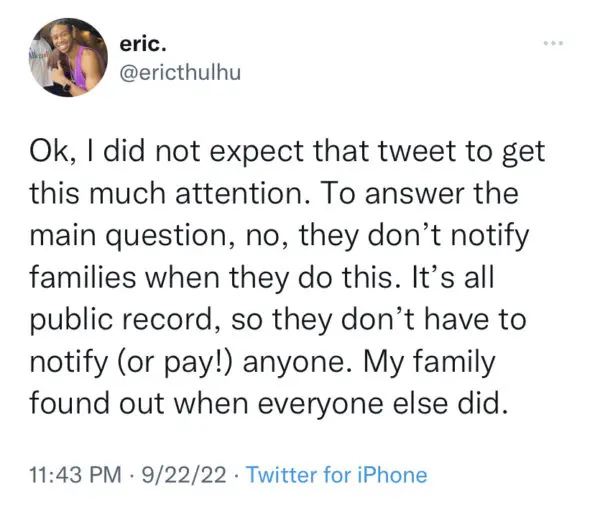 “Ok. I did not expect that tweet to get this much attention. To answer the main question, no, they don’t notify families when they do this. It’s all public record, so they don’t have to notify (or pay!) anyone. My family found out when everyone else did.”