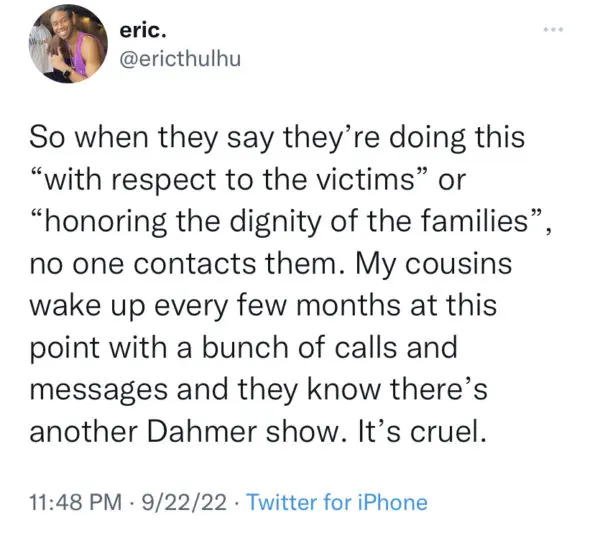 “So when they say they’re doing this ‘with respect to the victims’ or ‘honoring the dignity of the families,’ no one contacts them. My cousins wake up every few months at this point with a bunch of calls and messages and they know there’s another Dahmer show. It’s cruel.”