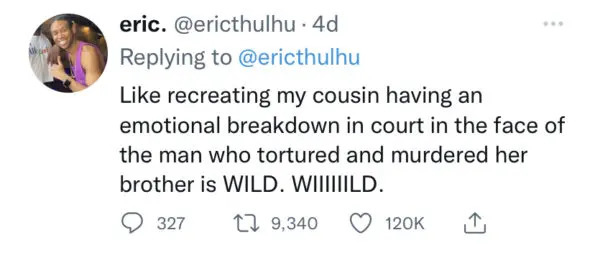 “Recreating my cousin having an emotional breakdown in court in the face of the man who tortured and murdered her brother is WILD. WIIIIIILD.”