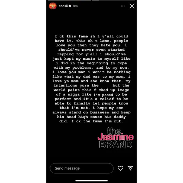 Toosii followed up on his Instagram stories with a lengthy post that directly addressed his young son (among other things). Citing the pressures of the world, he doubled down on the fact that he has nothing but pure intentions toward Samaria.