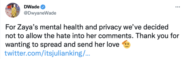 Amid celebrities and fans admiring the photo on social media, some noticed that comments under the 15-year-old’s picture had been blocked. Dwyane Wade took to Twitter to explain their families decision to limit Zaya’s comment section. The father of four tweeted: