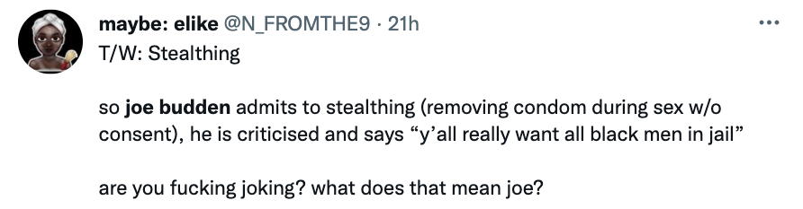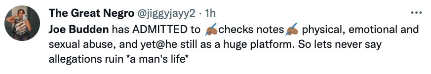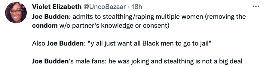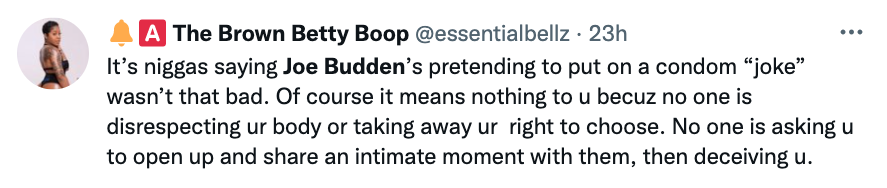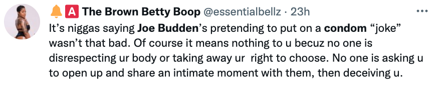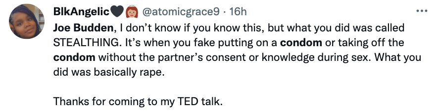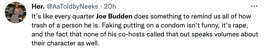 While his co-hosts collectively laugh at the story of him planning to cum in women without consent, one refer’s to Budden as a “sicko”, to which the former rapper responded: