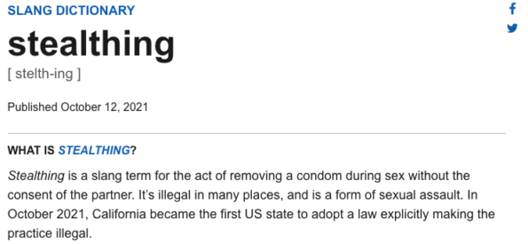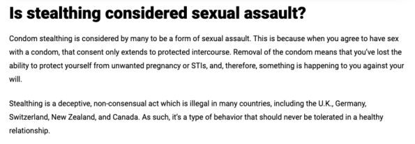 By standard of many laws the action of “stealthing” is considered sexual assault. The term is defined as when a man purposely removes or damages a condom during sexual contact without telling his partner. At this time, California is the only US state where the action is illegal.