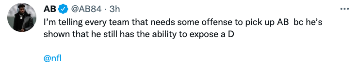 “I’m telling every team that needs some offense to pick up AB bc he’s shown that he still has the ability to expose a D