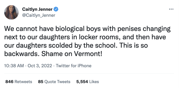 “We cannot have biological boys with penises changing next to our daughters in locker rooms, and then have our daughters scolded by the school. This is so backwards. Shame on Vermont!”