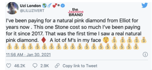 “I’ve been paying for a natural pink diamond from Elliot for years now. This one Stone cost so much I’ve been paying for it since 2017. That was the first time I saw a real natural pink diamond. A lot of M’s in my face.”