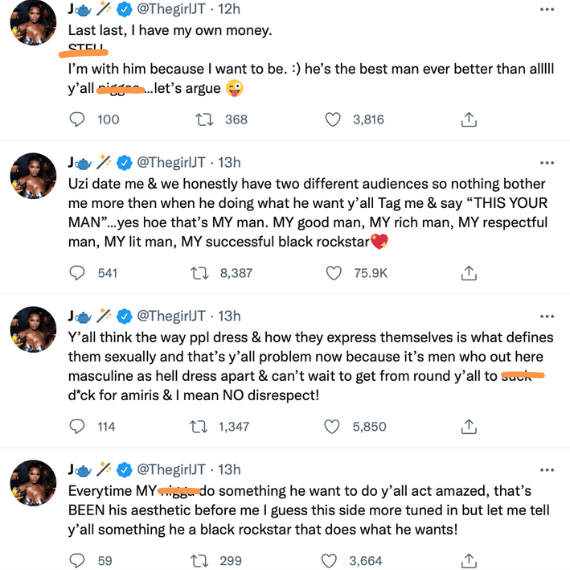 “Everytime MY n*gg* do something he want to do y’all act amazed, that’s BEEN his aesthetic before me I guess this side more tuned in but let me tell y’all something he a black rockstar that does what he wants!”