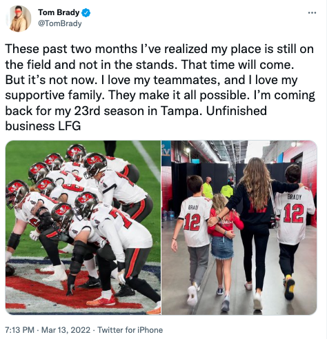 Brady, a lone seven time Super Bowl winning athlete, shook the sports world announcing his retirement following the 2021 season. However his post football life was seemingly not enough for the quarterback, as he announced he’d be returning for the 2022 season after two short months. In the announcement post he wrote: