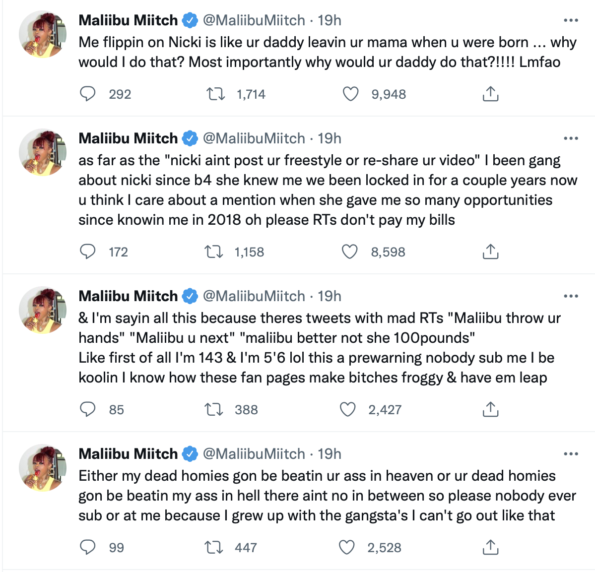“As far as the “nicki aint post ur freestyle or re-share ur video” I been gang about nicki since b4 she knew me we been locked in for a couple years now u think I care about a mention when she gave me so many opportunities since knowin me in 2018 oh please RTs don’t pay my bills.”