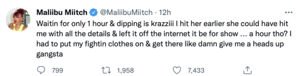“Waitin for only 1 hour & dipping is krazziii I hit her earlier she could have hit me with all the details & left it off the internet it be for show … a hour tho? I had to put my fightin clothes on & get there like damn give me a heads up gangsta.”