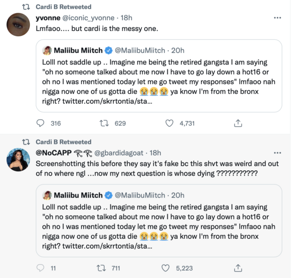 Cardi took to Twitter to retweet fans sharing tweets from Maliibu’s Twitter rant, claiming the rapper is messy and added herself to the “Cardi B hate train.”