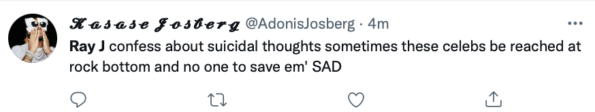 “Ray J confess about suicidal thoughts sometimes these celebs be reached at rock bottom and no one to save em’ SAD.”