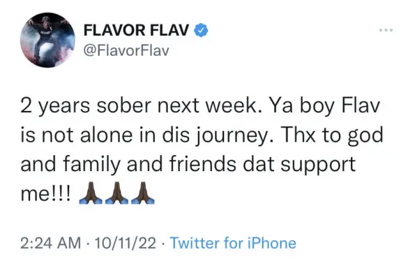 “2 years sober next week. Ya boy Flav is not alone in dis journey. Thx to god and family and friends dat support me!!!”