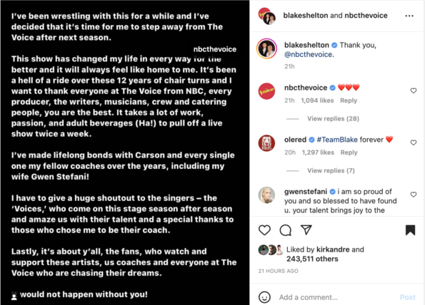 “I’ve been wrestling with this for a while and I’ve decided that it’s time for me to step away from The Voice after season 23. This show has changed my life in every way for the better and it will always feel like home to me. It’s been a hell of a ride over these 12 years of chair turns and I want to thank everyone at The Voice from NBC, every producer, the writers, musicians, crew and catering people, you are the best.”
