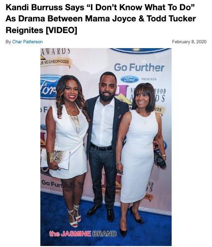 Subsequently, the “No Scrubs” writer began dating RHOA staff member Todd Tucker, who has also received the short end of his wife’s mother’s blessing. Back in 2020, the mother and son in law had a subtle feud after Joyce suggested leaving her granddaughter Riley as her beneficiary to ensure she’d be taken care of following her death, suggesting Tucker was untrustworthy of caring for her. Riley is Kandi’s eldest daughter from a previous relationship.