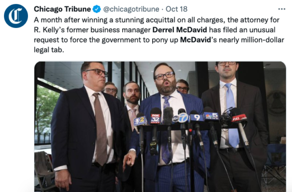 “Mr. McDavid’s life was unalterably changed by the frivolous, vexatious, and bad faith prosecution over which he prevailed….The jury even acquitted Robert Kelly of more than half of the charges levied against him, in large part, based on the lies and falsehoods exposed by Mr. McDavid’s vigorous defense.”