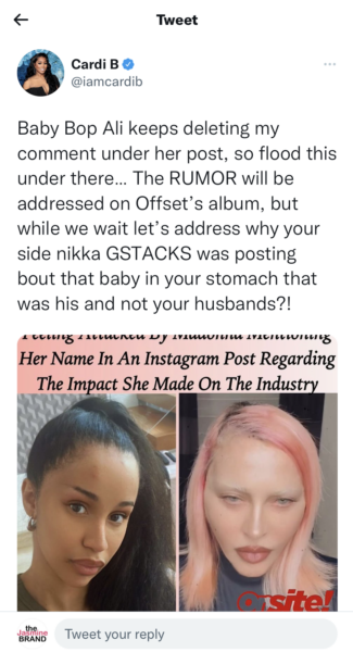 “Baby Bop Ali keeps deleting my comment under her post, so flood this under there… The RUMOR will be addressed on Offset’s album, but while we wait let’s address why your side nikka GSTACKS was posting bout that baby in your stomach that was his and not your husbands?!”