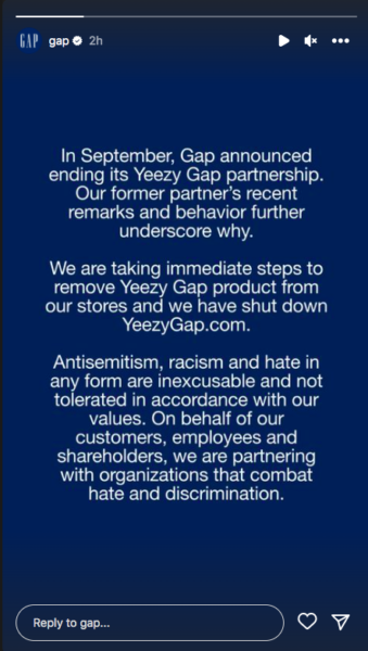 “In September, Gap announced ending its Yeezy Gap partnership. Our former partner’s recent remarks and behavior further underscore why. We are taking immediate steps to remove Yeezy Gap product from our stores and we have shut down Yeezygap.com.”