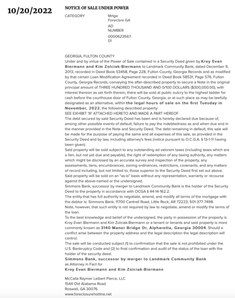 “Under and by virtue of the Power of Sale contained in a Security Deed given by Kroy Evan Biermann and Kim Zolciak-Biermann to Landmark Community Bank, dated December 9, 2013, recorded in Deed Book 53458, Page 228, Fulton County, Georgia Records and as modified by that certain Loan Modification Agreement recorded in Deed Book 58531, Page 576, Fulton County, Georgia Records, conveying the after-described property to secure a Note in the original principal amount of THREE HUNDRED THOUSAND AND 0/100 DOLLARS ($300,000.00).”