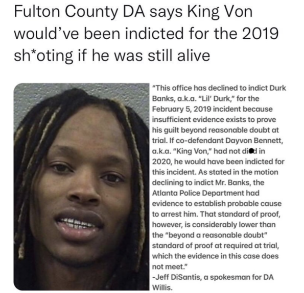 “If co-defendant Dayvon Bennett, a.k.a. ‘King Von,’ had not died in 2020, he would have been indicted for this incident. As stated in the motion declining to indict Mr. Banks, the Atlanta Police Department had evidence to establish probable cause to arrest him.”