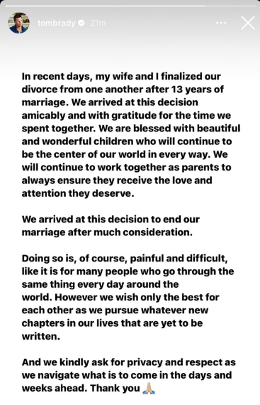 This morning (Oct. 28) Tom Brady took to his Instagram story to reveal that he and his wife Gisele Bündchen have come to an agreement to finalize their divorce. The Tampa Bay quarterback shared:
