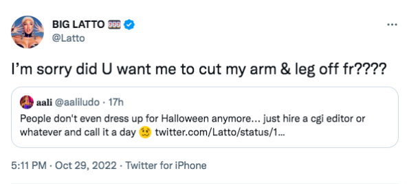 Latto seemingly pulled out the full CGI effects for her look as the Corpse Bride. The Atlanta native also addressed a critic who scrutinized her for not “dressing up” in a more casual way. The naysayer wrote,