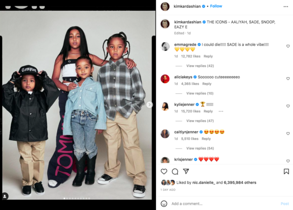 North dressed as Aaliyah, rocking the late singer’s Tommy Hilfiger commercial look from the ’90s. Saint transformed into Snoop Dogg and was photographed wearing a black and white flannel similar to the one Snoop wore in a photo taken with Dr. Dre in 1993. Psalm also dressed as a Hip-Hop O.G. and channeled his inner Eazy-E. The young child wore a black button-up jacket with a “Compton” hat. And Chicago, who Kanye previously made claims was kidnapped by his ex, posed as a mini Sade Adu.