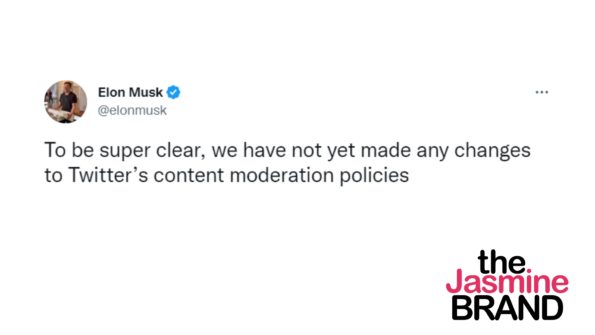 “To be perfectly clear, we have not yet made any changes to Twitter’s content moderation policies.”