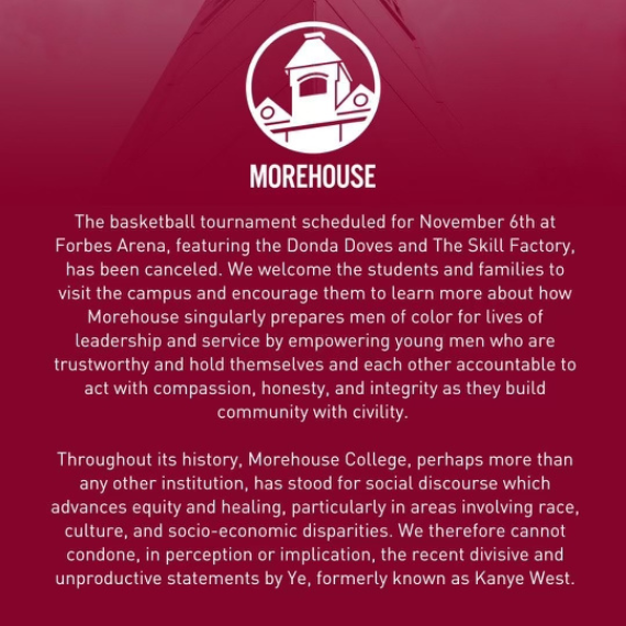 Morehouse College is the latest to decline business with the 45-year-old rapper due to his reputation. Even though Ye recently offered his version of an apology for his remarks that have hurt people across the world, Morehouse College has decided to terminate the Donda Doves vs. the Skill Factory basketball tournament, which was set to take place on Sunday (Nov. 6). In a statement from Morehouse College, staff said: