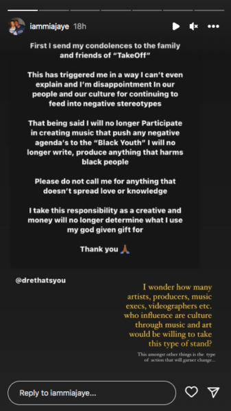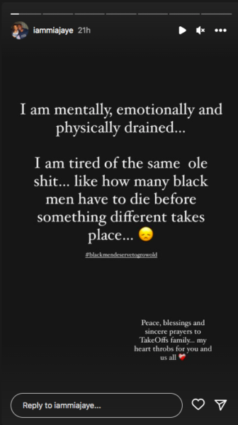 On Tuesday (Nov. 1), Mia Jaye took to Instagram and reposted a message from A&R executive Dre Hunter on gun violence in the Hip-Hop community following Takeoff’s death.