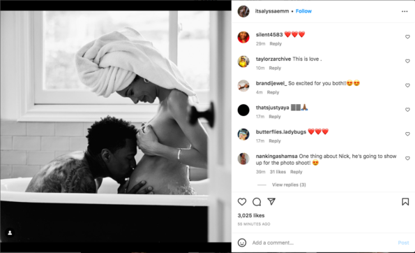 The pair took to the internet today (Nov. 3) to share with the world images from their intimate maternity photoshoot. In the pictures both Alyssa and Nick appear to be happy as they pose in a bathtub. In one of the images, the “Wild ‘n Out” star gives Alyssa’s growing belly a gentle kiss.