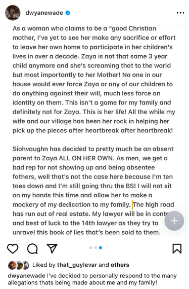 This morning (Nov. 3) Dwyane Wade took to Instagram to speak out against his ex-wife’s, Siohvaughn Funches, claims that he’s attempting to compensate off of their 15-year-old transgender daughter’s, Zaya, “name and gender change.” Putting a pause on celebrating his current wife’s, Gabrielle Union, 50th birthday, the former Miami Heat player said: