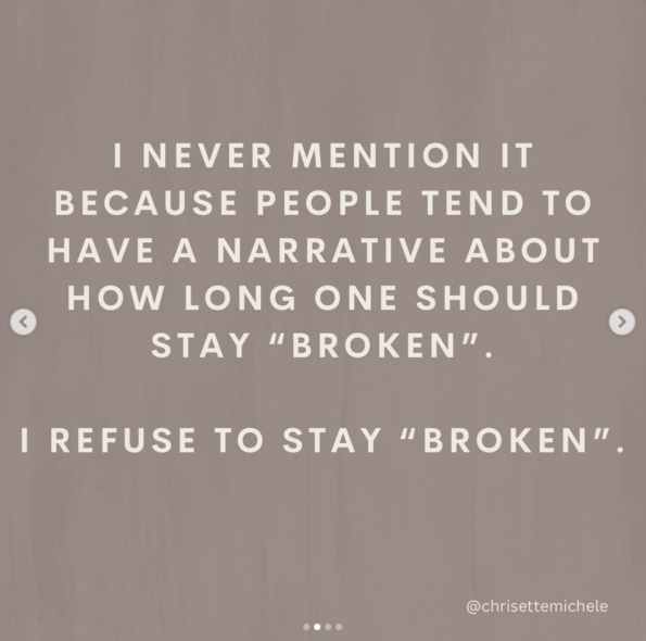 “I never mention it because people tend to have a narrative about how long one should stay ‘broken.’ I refuse to stay ‘broken.’”