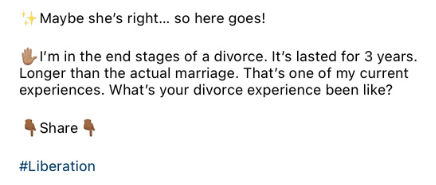 “I’m in the end stages of a divorce. It’s lasted for 3 years. Longer than the actual marriage. That’s one of my current experiences. What’s your divorce experience been like? Share #Liberation”
