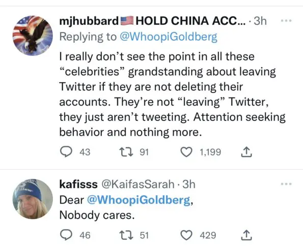 As no surprise, social media had an opinion about the EGOT winner joining the list of celebrities leaving Twitter. Some people understood Goldberg’s reasons for leaving the social media app, while others could care less about her departure. One user wrote: